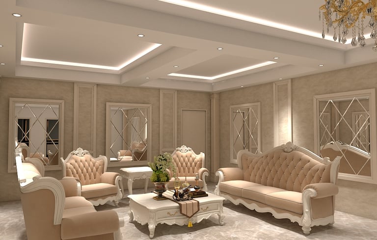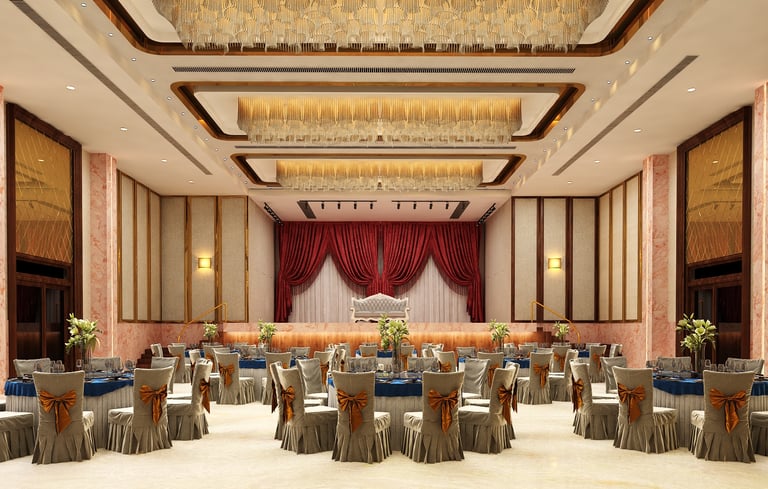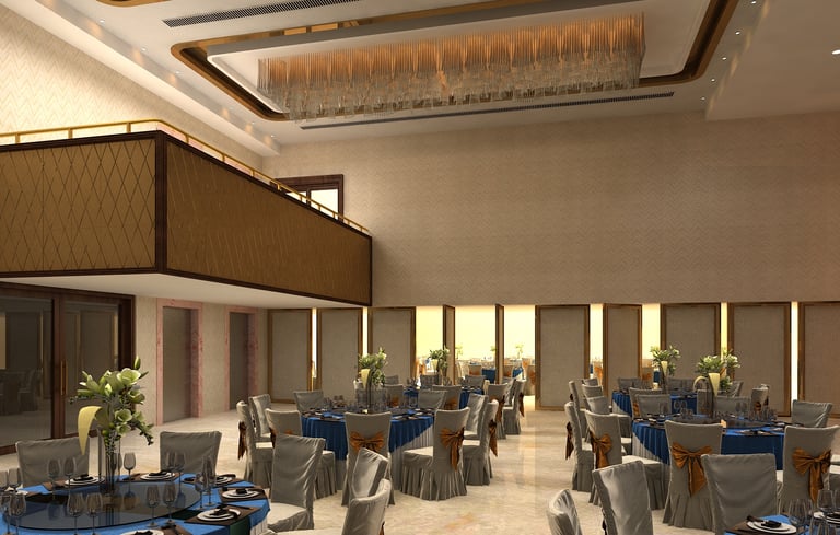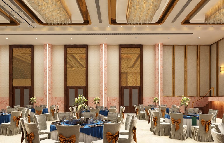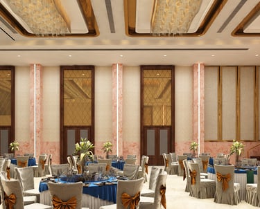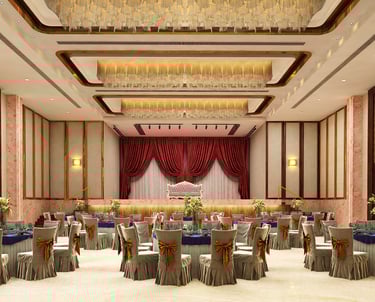 This banquet hall was designed to create a grand and luxurious atmosphere suitable for celebrations and special events. The interiors feature elegant design elements, rich finishes, and statement chandeliers that add a sense of sophistication and visual impact to the space. Carefully planned lighting enhances the ambience while highlighting the architectural details. The overall design focuses on creating a spacious, welcoming, and luxurious environment that elevates the experience of every gathering.